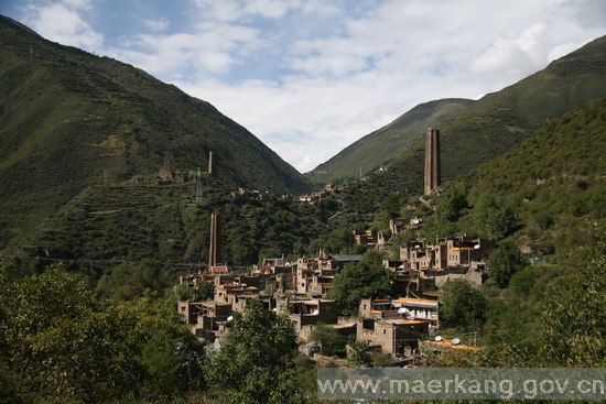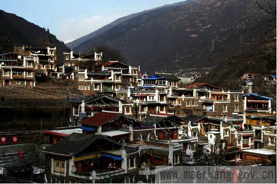 1.民居:嘉绒藏族的住房与草原牧区的帐房和松潘、南坪一带的木板房相比,另具特色。建筑多在背风向阳、土质坚实且方便生产和生活的地方,大多依地势择险而居。用泥土片石砌筑而成,方正高耸,片石堆砌讲究,层层叠压,房屋四角上翘,立面呈上小下大的梯形,一般三至四层。顶层半封闭式向阳敞开,设有经堂与客房,造型美观,冬暖夏凉,门窗装饰艳丽美观。具有独特的垒石为屋建筑传统和“邛笼”式建筑风格,其典型代表西索民居、草登民居、克莎民居等。