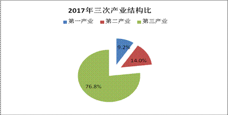 经济结构。第一、二、三产业增加值占地区生产总值的比重由上年的9.5:14.5:76.0变动为9.2:14.0:76.8。第一产业下降0.3个百分点,第二产业下降0.5个百分点,第三产业提高0.8 百分点。