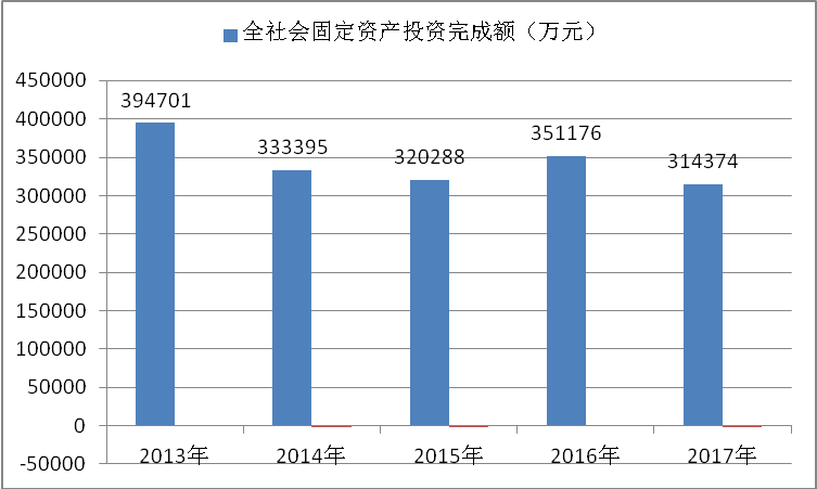 全年完成全社会固定资产投资314374万元,比上年下降10.5%,其中:固定资产投资286374万元,同比下降14.0%。